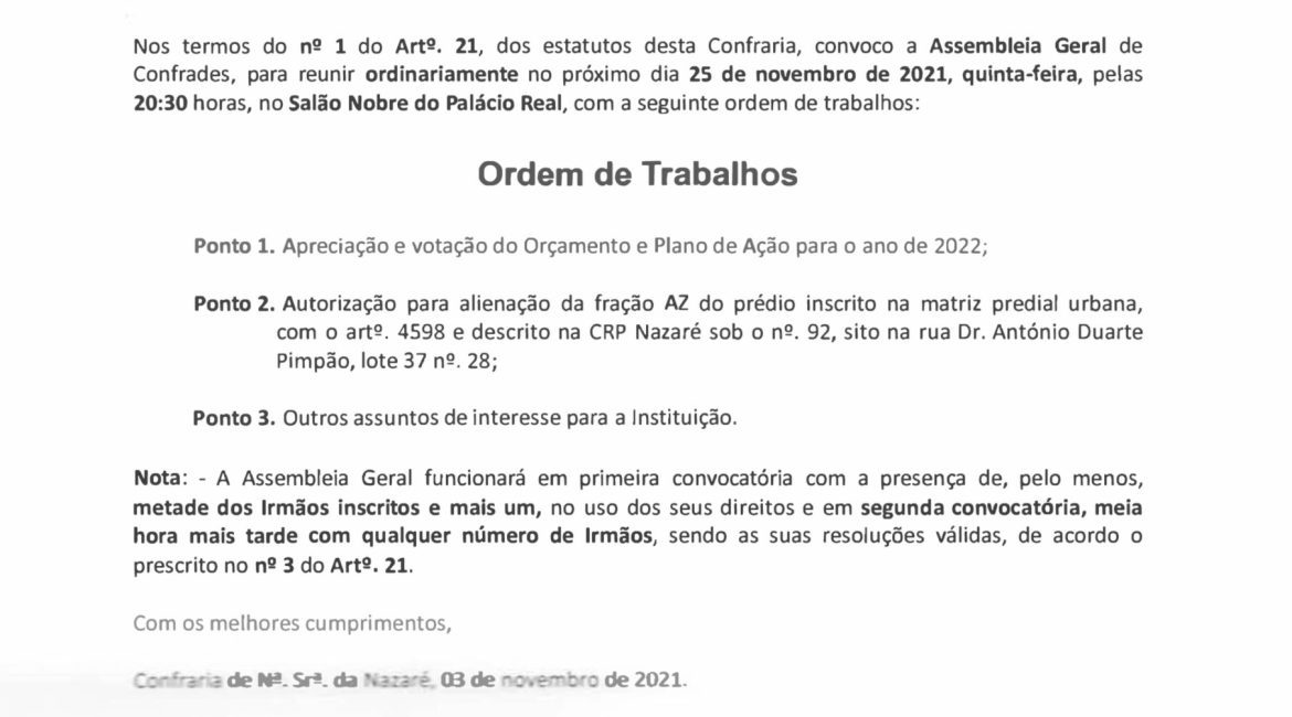 Realiza-se no dia 25 de Novembro Quinta-Feira, pelas 20h30, no Salão Nobre do Palácio Real, a reunião ordinária de Assembleia Geral de Confrades.