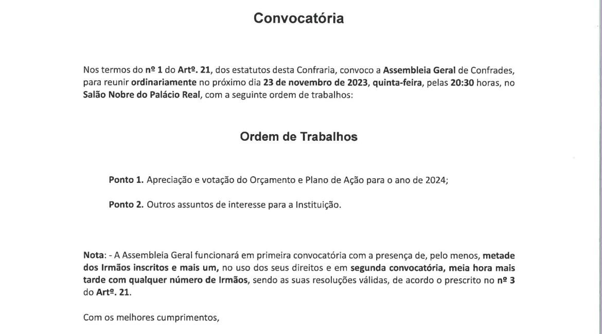 Realiza-se no dia 23 de Novembro, Quinta-Feira, pelas 20h30, no Salão Nobre do Palácio Real, a reunião ordinária de Assembleia Geral de Confrades.