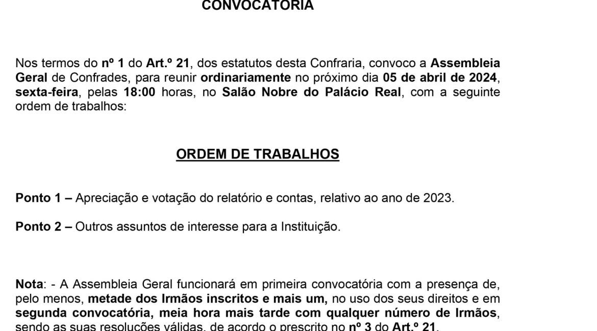Realiza-se no dia 5 de Abril, Sexta-Feira, pelas 18h00, no Salão Nobre do Palácio Real, a reunião ordinária de Assembleia Geral de Confrades.