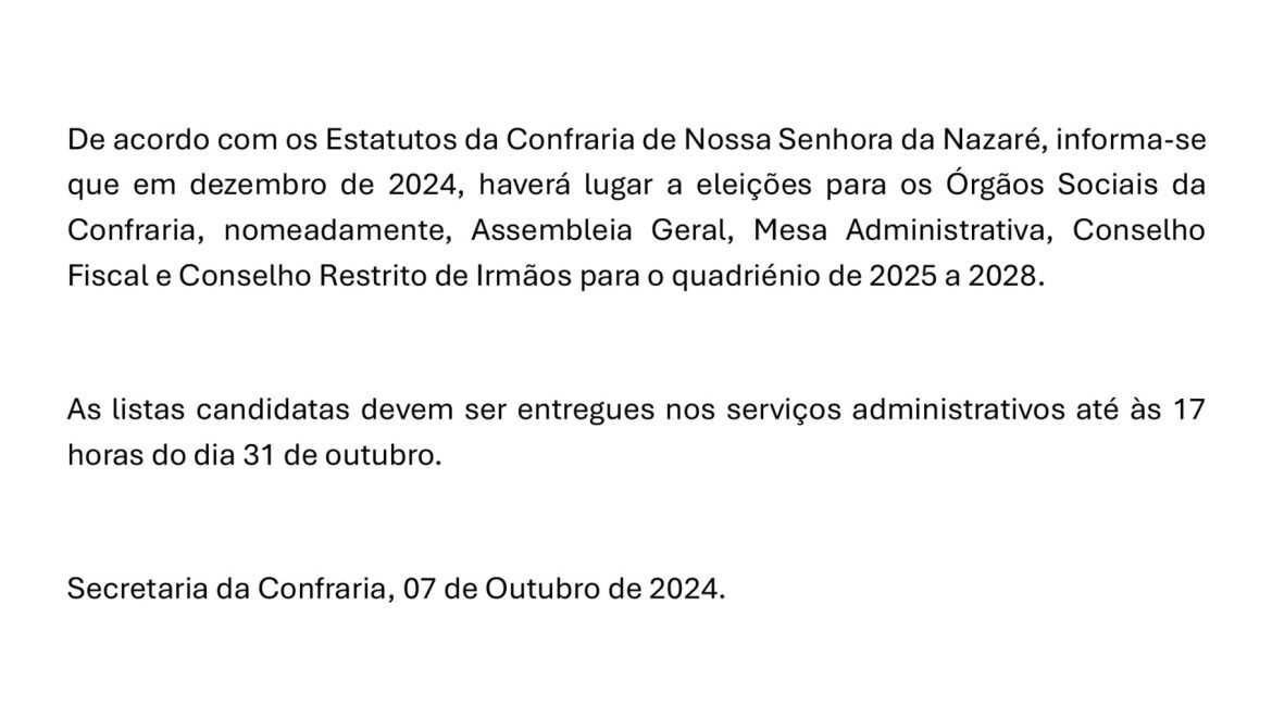 De acordo com os Estatutos da Confraria de Nossa Senhora da Nazaré, informa-seque em dezembro de 2024, haverá lugar a eleições para os Órgãos Sociais daConfraria, nomeadamente, Assembleia Geral, Mesa Administrativa, ConselhoFiscal e Conselho Restrito de Irmãos para o quadriénio de 2025 a 2028. As listas candidatas devem ser entregues...
