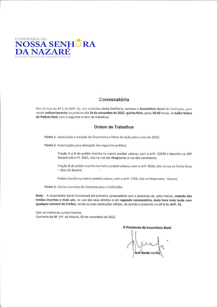 Realiza-se no dia 24 de Novembro, Quinta-Feira pelas 20:30 Horas, no Salão Nobre do Palácio Real, a reunião ordinária de Assembleia Geral de Confrades.